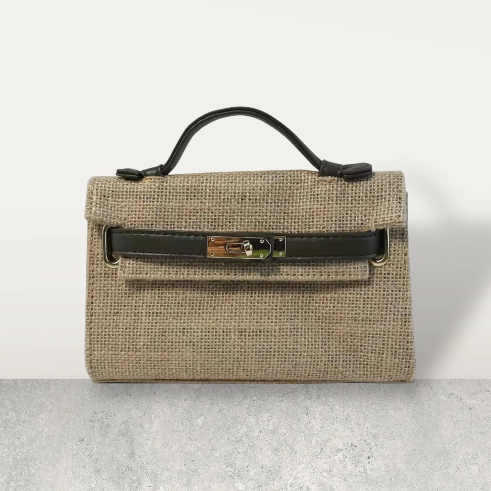Wholesale jute clutch bags by Travellers Hat Boutique with black handle and metal clasp closure