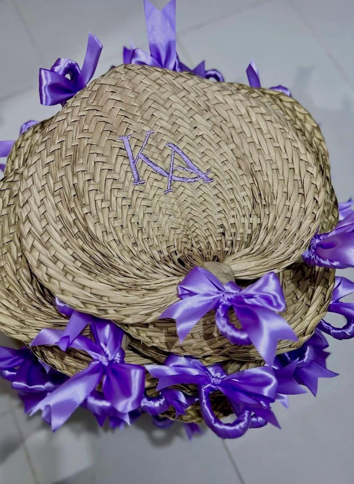 Personalized embroidered abaniko fan with purple ribbons displayed in a group from Travellers Hat Boutique