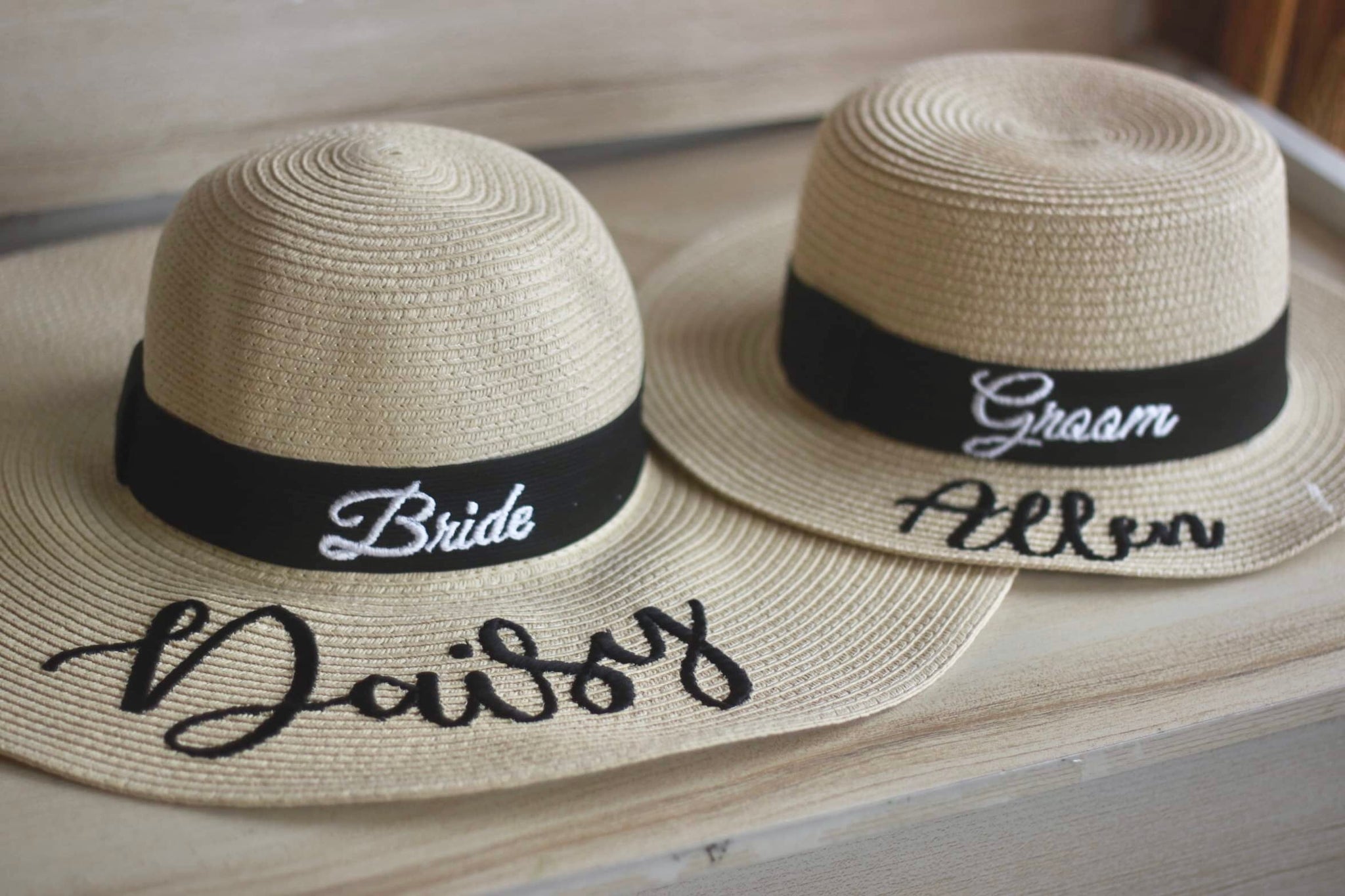 Custom prenuptial hat set featuring groom and bride straw hats with black bands and embroidered names