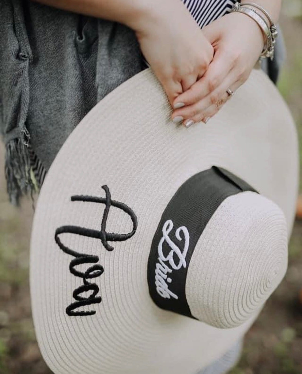 Custom prenuptial hat set with bride embroidery and wide brim held by person wearing bracelets