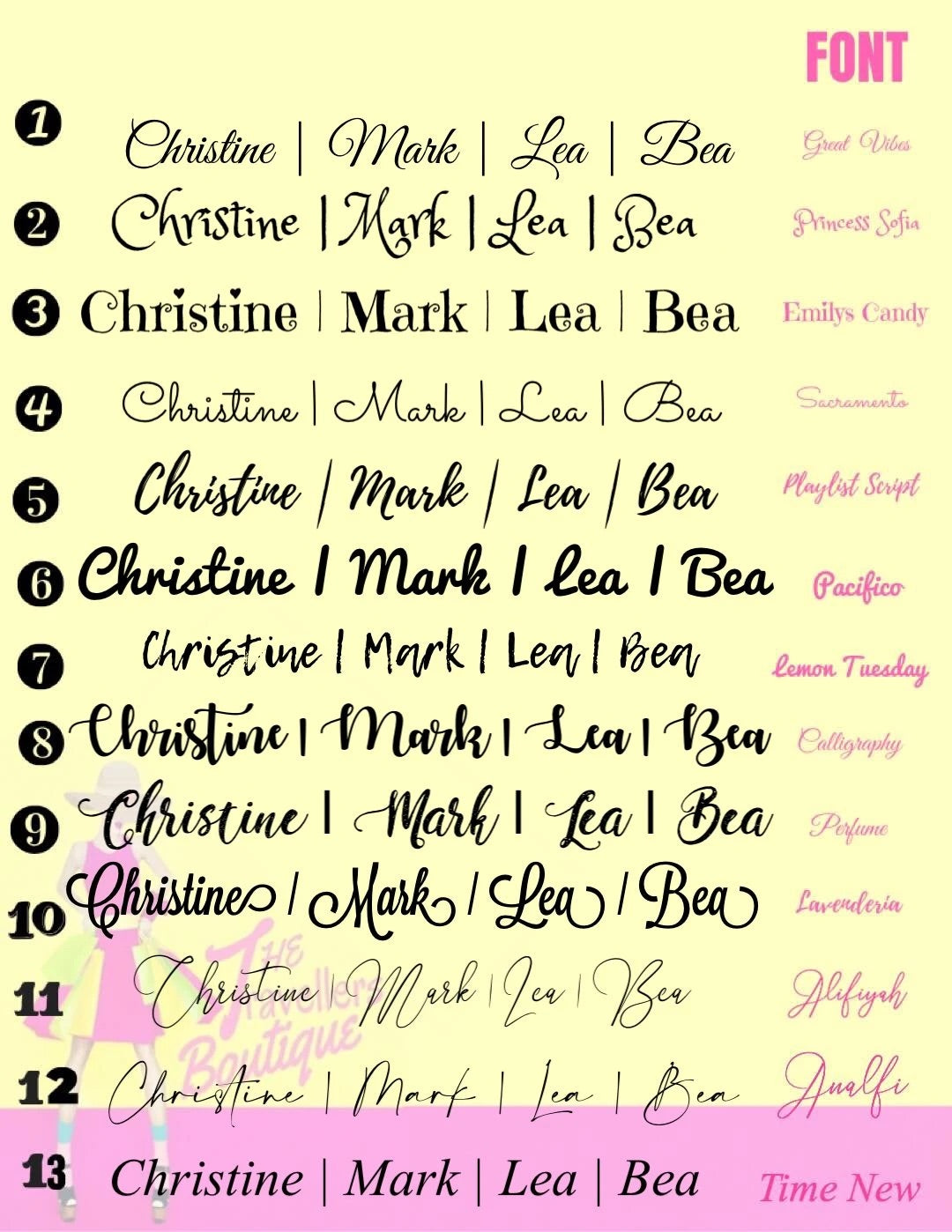 Custom prenuptial hat set font style options from Travellers Hat Boutique displaying elegant script and bold types