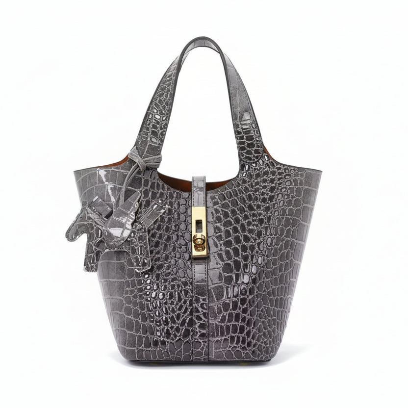 Gray crocodile-embossed handbag with gold clasp on a white background