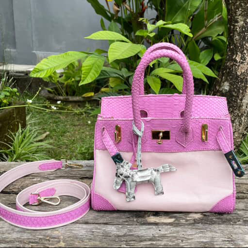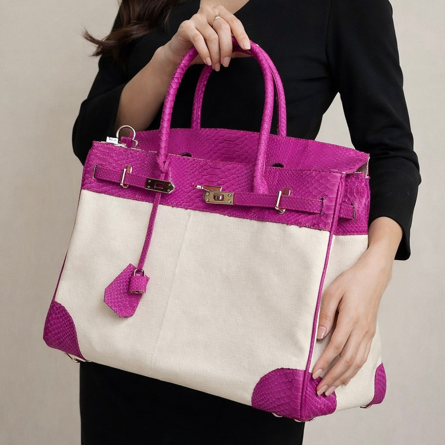 Handcrafted from genuine python snake skin paired with premium canvas, this distinctive bag combines natural texture with refined durability. Each piece is customizable in size and color, allowing you to tailor it to your personal style and needs. The artisan construction ensures quality craftsmanship, while the exotic python detailing adds an unmistakable touch of sophistication.